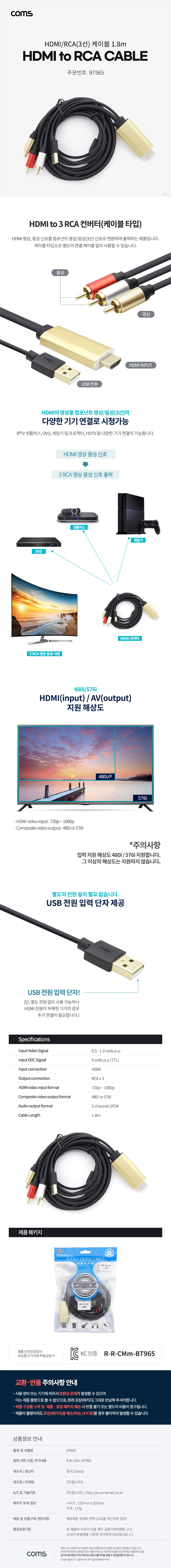 [294457]Coms(ÄĽº) HDMI/RCA(3¼±) ÄÉÀ̺í / HDMI ÄÁ¹öÅÍ (HDMI to AV) / USB Power / 1.8¹ÌÅÍ(1.8m) [BT965]