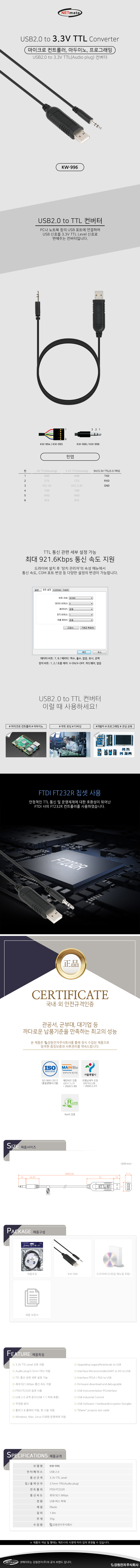 [291529]NETmate(³Ý¸ÞÀÌÆ®) USB2.0 to 3.3V TTL(Audio plug) ÄÁ¹öÅÍ(FTDI / 1.8m) [KW-996]