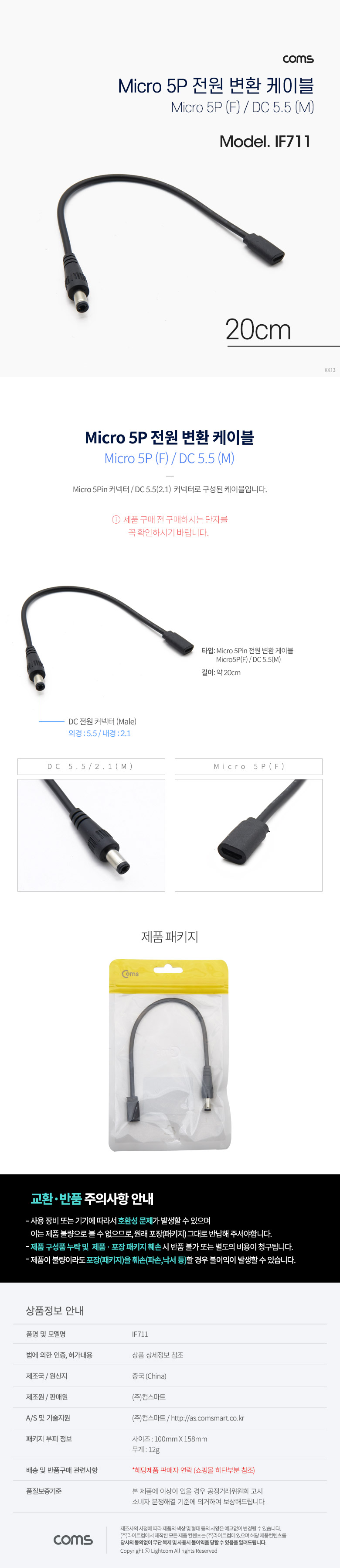 [298955]Coms(ÄĽº) Micro 5Pin Àü¿ø º¯È¯(DC 5.5/2.1) ÄÉÀ̺í 0.2¹ÌÅÍ(0.2m) [IF707]