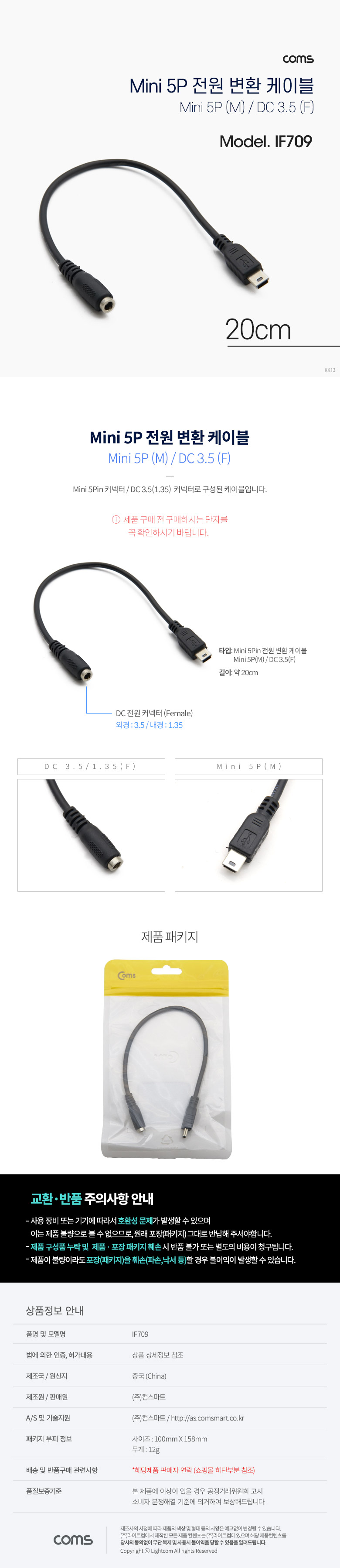 [298953]Coms(ÄĽº) Mini 5Pin Àü¿ø º¯È¯(DC 3.5/1.35) ÄÉÀ̺í 0.2¹ÌÅÍ(0.2m) [IF709]