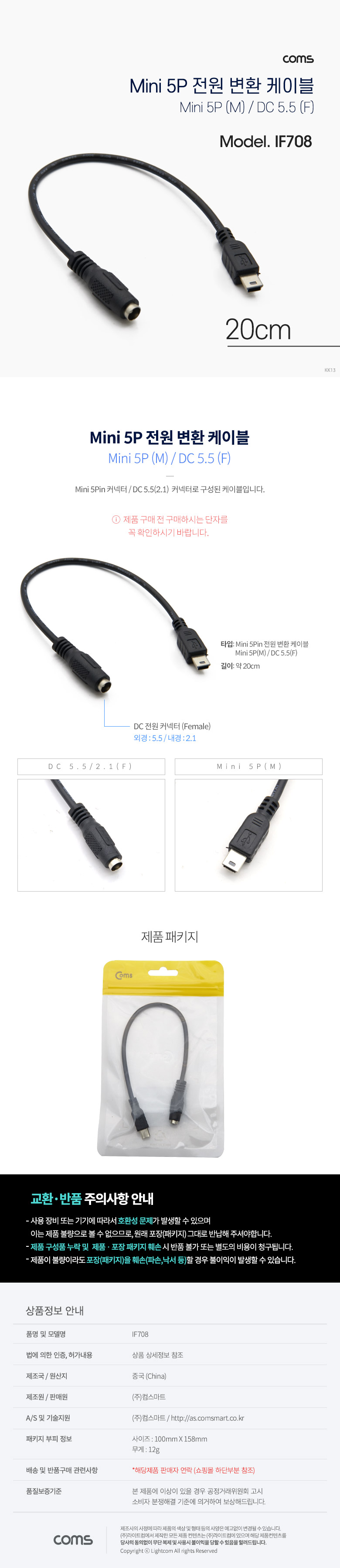 [298954]Coms(ÄĽº) Mini 5Pin Àü¿ø º¯È¯(DC 5.5/2.1) ÄÉÀ̺í 0.2¹ÌÅÍ(0.2m) [IF708]