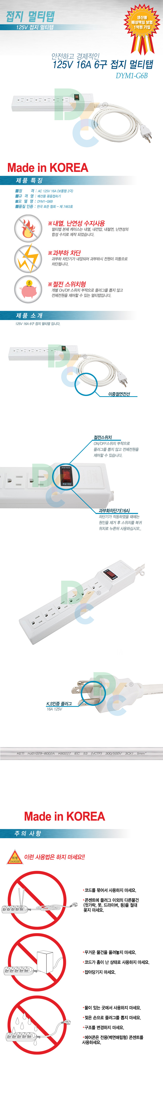 [100523]DYC(µ¿¾ç) 6±¸ Á¢Áö ¸ÞÀνºÀ§Ä¡ ¸ÖƼÅÇ 125V(110V/110º¼Æ®) 16A 5¹ÌÅÍ(5m) [DYM1-G6B] *Äܼ¾Æ®È®Àοä¸Á*