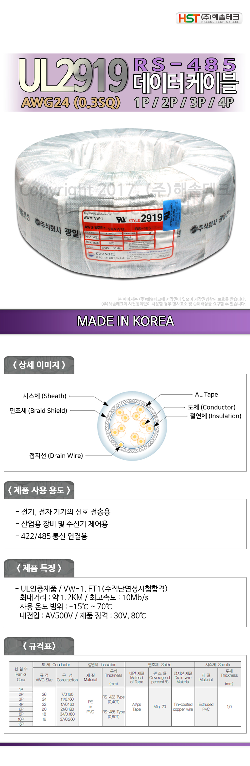 [149904](OEM) UL2919 RS485 AWG24X2P(4°¡´Ú)ÄÉÀ̺í 500¹ÌÅÍ(500m)